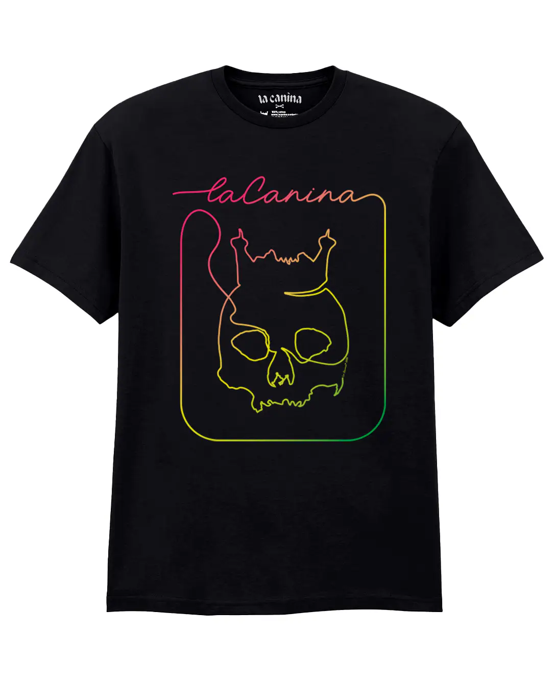 El contraste del degradado cromático sobre el algodón negro de 180g resalta la pureza de un trazo que no necesita interrupciones para contar nuestra historia.