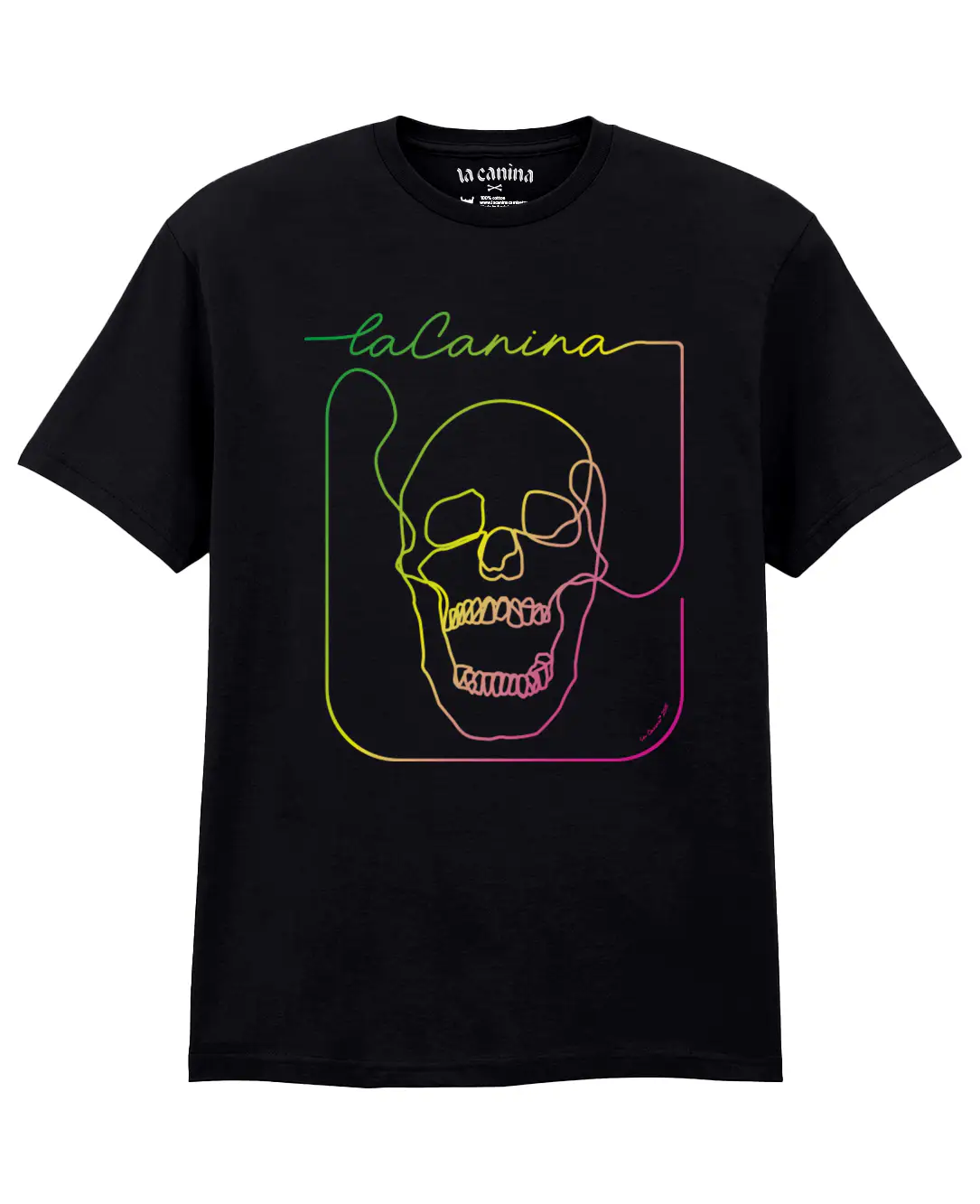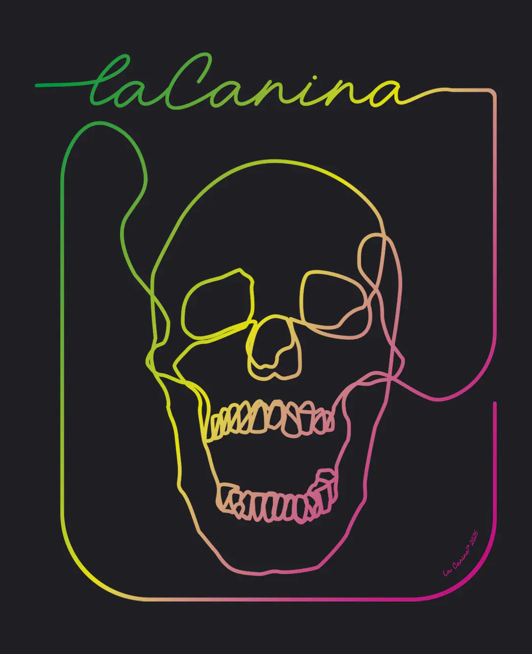 En este diseño, el cráneo se redefine a través de líneas cinéticas con un degradado que transita del verde ácido al rosa intenso.