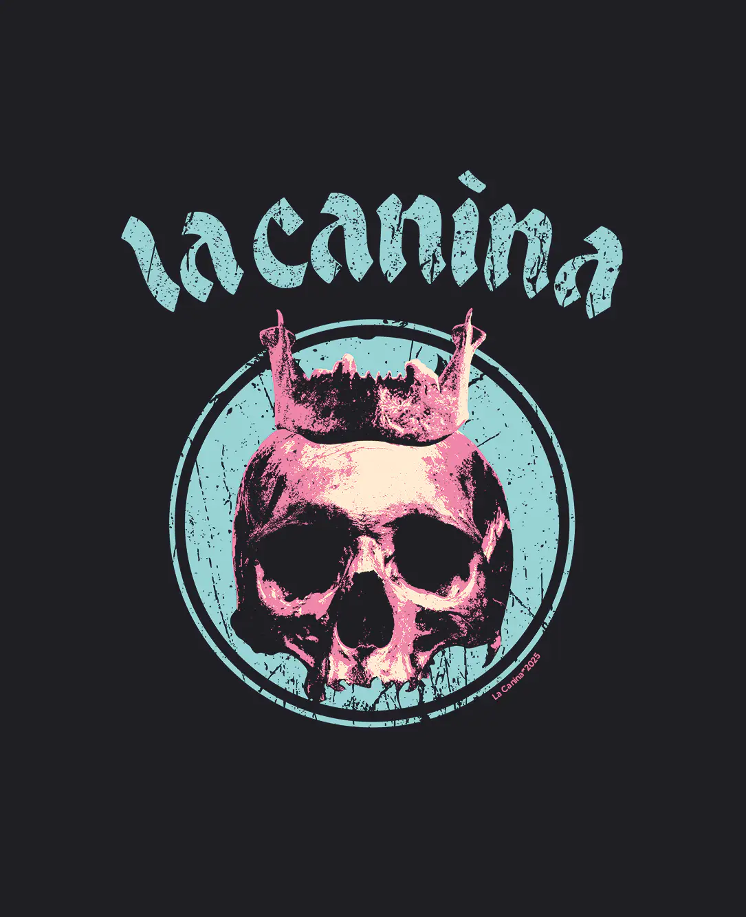 Gráfica circular que respeta la anatomía original del logo de La Canina™: cráneo y mandíbula como corona en un contraste cromático de alta intensidad.